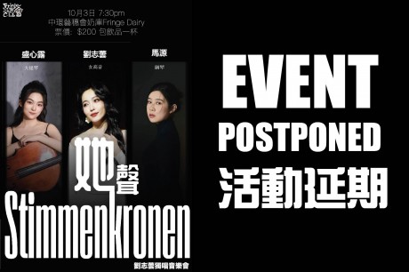 由于台风「麦德姆」可能带来安全隐患,原定于10月3日举行的「Stimmenkronen『她』声——刘志芸独唱音乐会」将延期举行,具体日期容后公布。